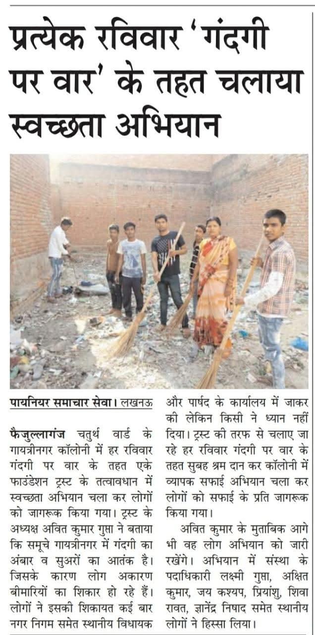 ‘गंदगी पर वार’ अभियान के तहत ट्रस्ट द्वारा प्रत्येक रविवार नियमित रूप से स्वच्छता अभियान चलाया जाता है। श्रमदान के माध्यम से कॉलोनी की सफाई कर लोगों को स्वच्छता और स्वास्थ्य के प्रति जागरूक किया जा रहा है।