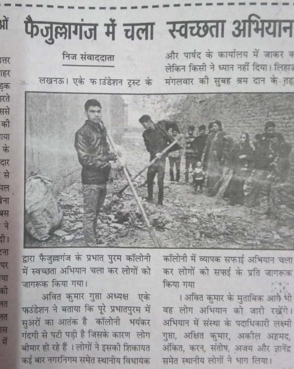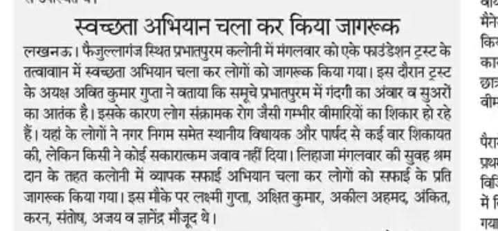 फैजुल्लागंज क्षेत्र की प्रभातपुरम कॉलोनी में एक फाउंडेशन ट्रस्ट की ओर से स्वच्छता अभियान चलाया गया। कॉलोनीवासियों ने श्रमदान कर सफाई की और लोगों को स्वच्छता के महत्व व बीमारियों से बचाव के प्रति जागरूक किया गया।