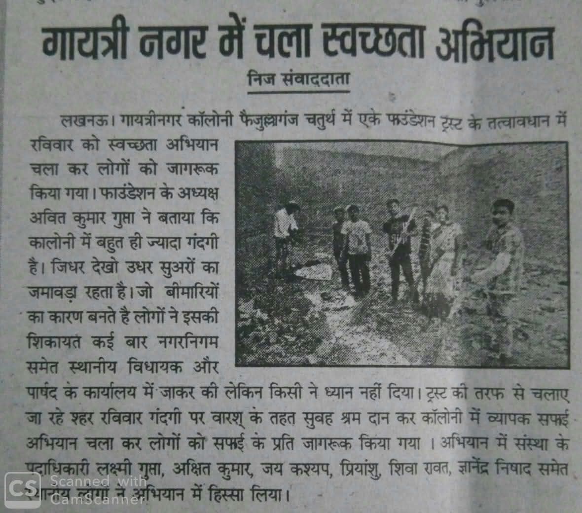 फैजुल्लागंज क्षेत्र की प्रभातपुरम कॉलोनी में फाउंडेशन ट्रस्ट के तत्वावधान में स्वच्छता अभियान चलाया गया। श्रमदान के माध्यम से कॉलोनी की सफाई कर लोगों को गंदगी और उससे फैलने वाली बीमारियों के प्रति जागरूक किया गया।