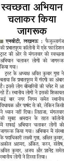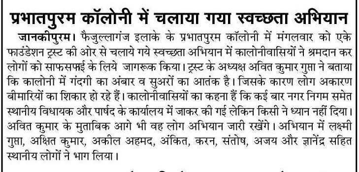 फैजुल्लागंज क्षेत्र की प्रभातपुरम कॉलोनी में एक फाउंडेशन ट्रस्ट की ओर से स्वच्छता अभियान चलाया गया। कॉलोनीवासियों ने श्रमदान कर सफाई की और लोगों को स्वच्छता के महत्व व बीमारियों से बचाव के प्रति जागरूक किया गया।